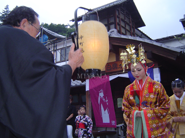 | 今年のミス草津扮する女神が「献湯の儀」のために、白旗の湯に向かっています。 |
